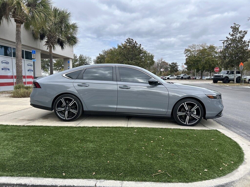2024 Honda Accord Hybrid Sport Gray WINDOW TINT, 2.0L 16V DOHC, 4-Wheel Disc Brakes, 8 Speakers, ABS brakes, Adaptive Cruise Control: Adaptive Cruise Control (ACC) with Low-Speed Follow, AM/FM radio, Apple CarPlay/Android Auto, Auto High-beam Headlights, Automatic temperature control, Blind Spot Information (BSI) System warning, Compass, Driver vanity mirror, Emergency communication system: HondaLink, Exterior Parking Camera Rear, Four wheel independent suspension, Front Bucket Seats, Front dual zone A/C, Front reading lights, Fully automatic headlights, Illuminated entry, Lane departure: Lane Keeping Assist System (LKAS) active, Leather Shift Knob, Leather steering wheel, Low tire pressure warning, Outside temperature display, Overhead console, Passenger vanity mirror, Power door mirrors, Power driver seat, Power moonroof, Power windows, Radio: 180-Watt Audio System, Rear reading lights, Remote keyless entry, Security system, Speed-sensing steering, Split folding rear seat, Steering wheel mounted audio controls, Telescoping steering wheel, Tilt steering wheel, Wheels: 19" x 8.5J Berlina Black.